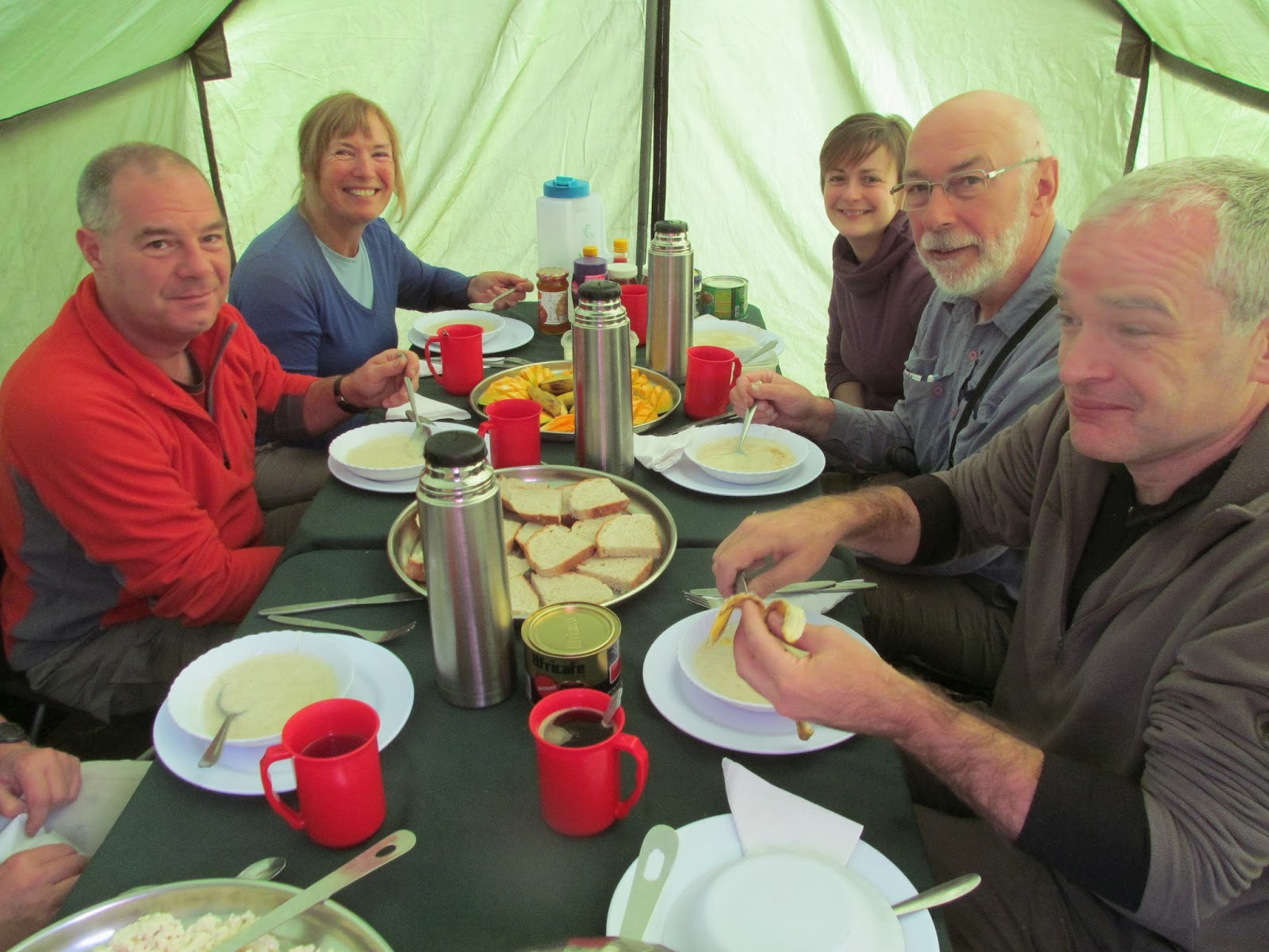 Day 3 - a 6 am wake-up call with tea and hot chocolate (milo) delivered to our tent, followed by breakfast in a dining tent, and that became the norm for the rest of the week. That day we only gained 2,000 feet in elevation but we crossed two valleys and it took us 7 hours to complete that segment. The final ascent to Shira Ridge was taxing for a long day on the trail. The porters remained behind when we left camp in the morning to pack up all of our gear but within an hour they were zipping by us carrying up to 20 kg's on their shoulders or head along with their own backpacks. They would always arrive at the next camp well before us and had our tents set up with our big packs already in the tents. They were amazing and do this for less than $15 a day but it is considered a good job to have in Tanzania. In the middle of the night when I went outside to use the toilet tent, I discovered frost on our 'home' which also became the norm and from then on I was sleeping with 3 layers on top. 7 pm became our regular bedtime as we tried to refresh our bodies and crawl into our cozy sleeping bags.